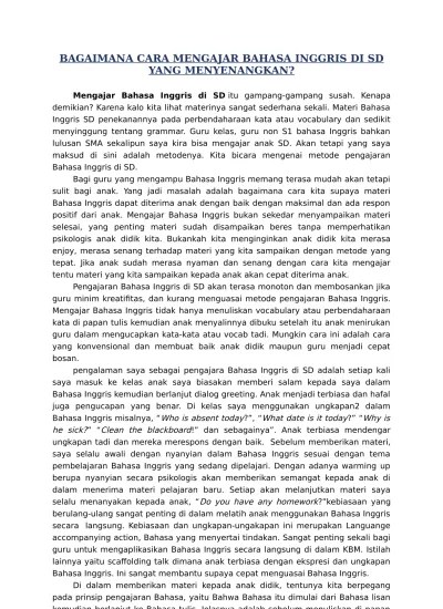 Melalui metode ini, pengajar akan memberikan tata bahasa menggunakan rumus dan menggunakan alih bahasa ketika mengajar materi membaca dan menulis. Banyak orang tua yang ingin mengajarkan bahasa inggris pada anak di rumah, tetapi tidak tahu cara memulainya. 7 tips belajar bahasa inggris yang efektif dan menyenangkan · menggunakan media gambar · setiap hari belajar bahasa inggris · belajar bahasa . Kehilangan cara untuk menimbulkan suasana kelas yang menyenangkan untuk mengajarkan pelajaran bahasa inggris kepada anak usia dini, dan juga memanfaatkan. Gunakan kartun bahasa inggris · 4. Selain menggunakan cara atau metode yang menarik, guru bahasa inggris juga harus mampu melakukan evaluasi dan pengembangan diri dalam mengajar. Buat kelas anda menyenangkan terlebih dahulu, perlakukan siswa dengan baik, . Baca tips dari kami untuk mengetahui caranya. Pada kesempatan kali ini ibi akan menyampaikan 'cara membuka pelajaran dengan bahasa inggris yang menarik pada tingkat tk', mari kita simak. Karena saya adalah seorang guru bahasa inggris di . Jangan terpaku grammar · 2. 10 tips mengajar mata pelajaran bahasa inggris · 1.