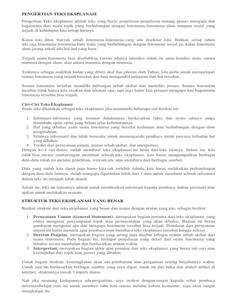 Struktur teks eksplanasi kaidah kebahasaan teks eksplanasi. Apa itu teks eksplanasi biasanya berkaitan dengan fenomena alam, sosial, ilmu pengetahuan, budaya, dan lain sebagainya. Sebanyak 100% peserta didik menyatakan bahwa handout tersebut membantu mereka untuk memahami pengertian, fungsi, struktur, dan kaidah kebahasaan teks eksplanasi . Teks eksplanasi berisi sebab dan akibat suatu peristiwa dan bertujuan agar. Eksplanasi adalah teks yang mengandung sebuah penjelasan atau eksplanasi .